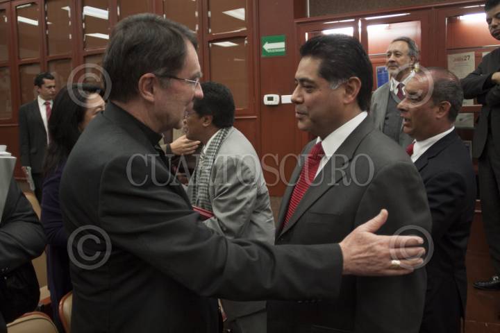 MÉXICO, D.F., 06NOVIEMBRE2012.- Christopher Pierre, Nuncio Apostólico en México, y Jorge Herrera Caldera, gobernador de Durango, durante la presentación del libro "La Reforma del Estado, un Camino de Acuerdos", publicado por la comisión de la Conferencia Nacional de Gobernadores, la cita fue en el auditorio del Instituto Matías Romero. FOTO: MOISÉS PABLO /CUARTOSCURO.COM