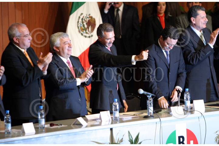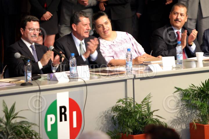 MEXICO, D.F. 12JULIO2005.- El secretario técnico del Consejo Político del PRI Mariano Palacios Alcocer, el senador y aspirante a la candidatura presidencial de ese partido Enrique Jackson, Beatríz Paredes presidenta de la fundación Colosio y Manlio Fabio Beltrones presidente de la mesa directiva de la cámara de diputados durante la sesión del consejo político nacional del tricolor FOTO: Miguel Dimayuga/CUARTOSCURO.COM