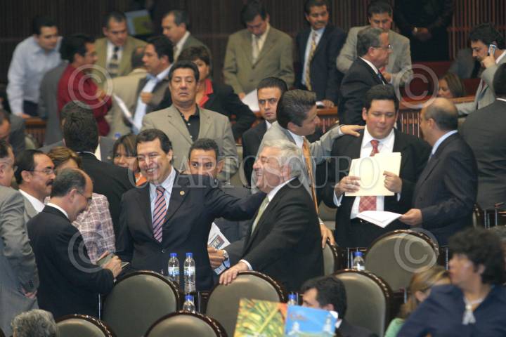 MEXICO, D.F.-12 SEPTIEMBRE.2005.- Emilio Chuayffet, lider de la fracción parlamentaria del PRI en la cámara de diputados conversa con algunos de sus compañeros de la bancada durante la sesión ordinaria en San Lázaro. FOTO: Nelly Salas/CUARTOSCURO.COM