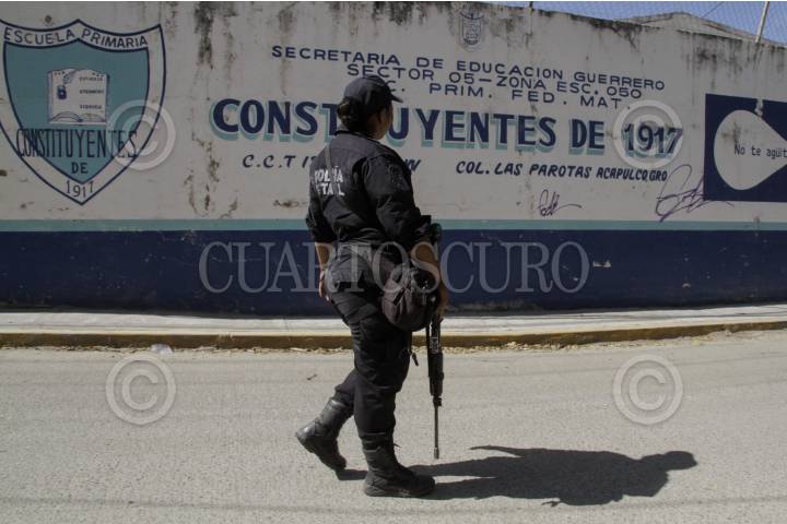 ACAPULCO, GUERRERO, 12ENERO2015.- A pesar de la inseguridad y la violencia presente en colonias de Guerrero, algunas escuelas han abierto sus puertas para continuar con el calendario escolar, resguardadas por elementos de la Policía Estatal o guardias de seguridad privada. FOTO: BERNANDINO HERNÁNDEZ /CUARTOSCURO.COM