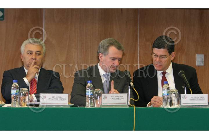 MEXICO, D. F. 18OCTUBRE2004.- Emilio Chuayfett, Coordinador de la Fracción Parlamentaria del PRI en la Cámara de Diputados, Santiago Creel, Secretario de Gobernación y Francisco Barrio, Coordinador de la Fracción Parlamentaria del PAN, durante la reunión de un grupo de trabajo para impulsar acuerdos en materia de procuración de justicia y seguridad pública, que se llevó a cabo en San Lázaro. FOTO: Nelly Salas/CUARTOSCURO.COM