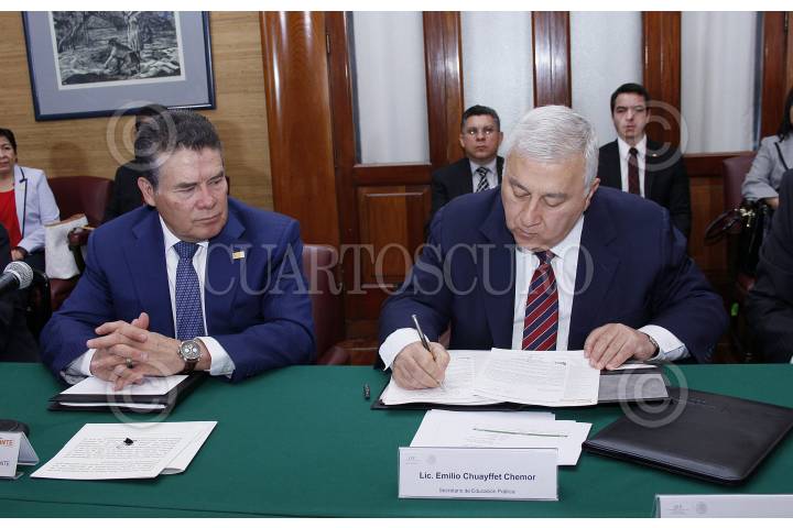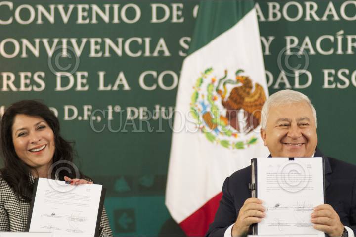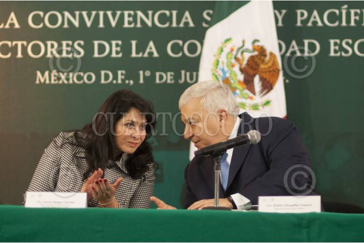 MÉXICO, D.F., 01JULIO2014.- Emilio Chauffet, Secretario de Educación Pública; y Laura Vargas Carrillo, titular del DIF Nacional; firmaron un convenio de colaboración para promover una convivencia pacífica en las escuelas. FOTO: IVÁN STEPHENS /CUARTOSCURO.COM