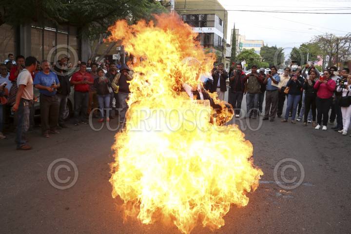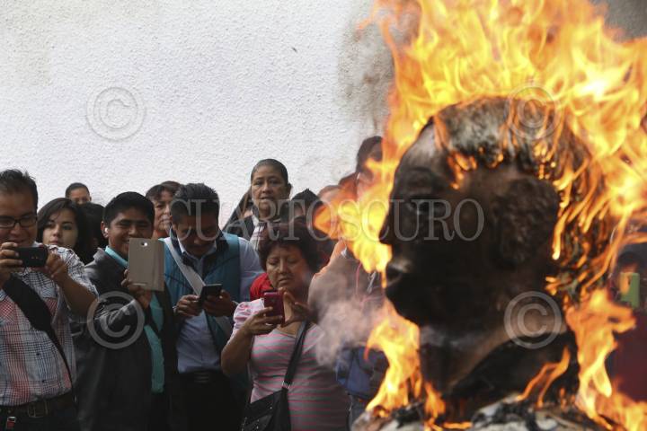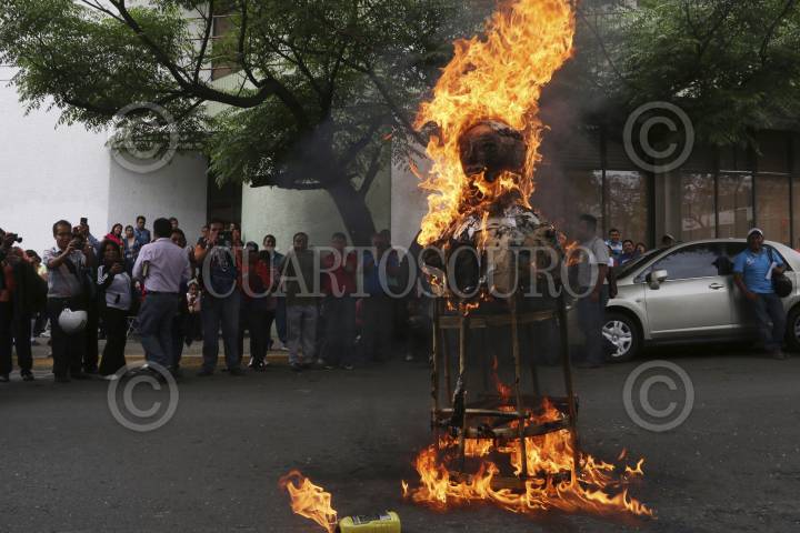 OAXACA, OAXACA, 23MARZO2015.- Profesores de la sección 22 de la CNTE se manifestaron en el exterior de la delegación estatal de la Secretaría de Educación Pública (SEP), sitio en el que prendieron fuego a una efigie del titular de esa dependencia, Emilio Chuayffet Chemor, a quien acusaron de intentar imponer por todos los medios la reforma educativa, misma que afirmaron no se aplicará en la entidad. FOTO: ARTURO PÉREZ ALFONSO /CUARTOSCURO.COM