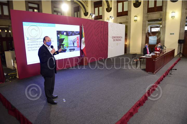 Marcos Bucio Mújica, subsecretario de Educación Básica, durante el informe diario sobre regreso a clases en el salón Tesorería de Palacio Nacioanl.