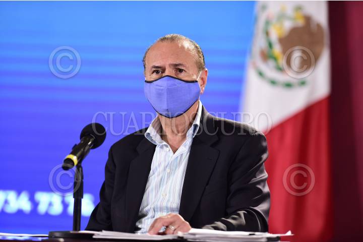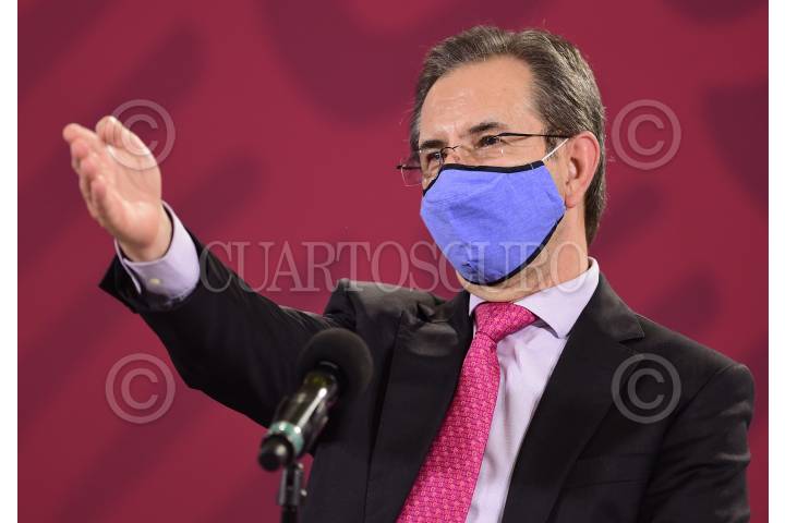 Esteban Moctezuma Barragán, secretario de Educación Pública, durante el informe diario sobre regreso a clases en el salón Tesorería de Palacio Nacioanl.