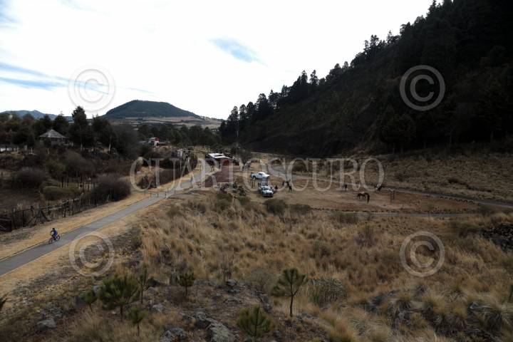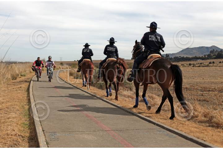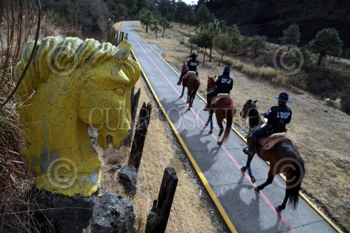 HUITZILAC, MORELOS, 19FEBRERO2017.- Para brindar seguridad a los ciclistas que usan la vía que une a los poblados de Parres, en Tlalpan, Ciudad de México y Fierro del Toro, en Huitzilac, Morelos, una patrulla de la Policía Montada de la Comisión de Seguridad Pública de Morelos realiza recorridos en la zona. La ciclopista fue habilitada en la antigua vía del ferrocarril México-Balsas, y en este sitio los asaltos son comunes, por lo que se implementó esta vigilancia. FOTO: MARGARITO PÉREZ RETANA /CUARTOSCURO.COM