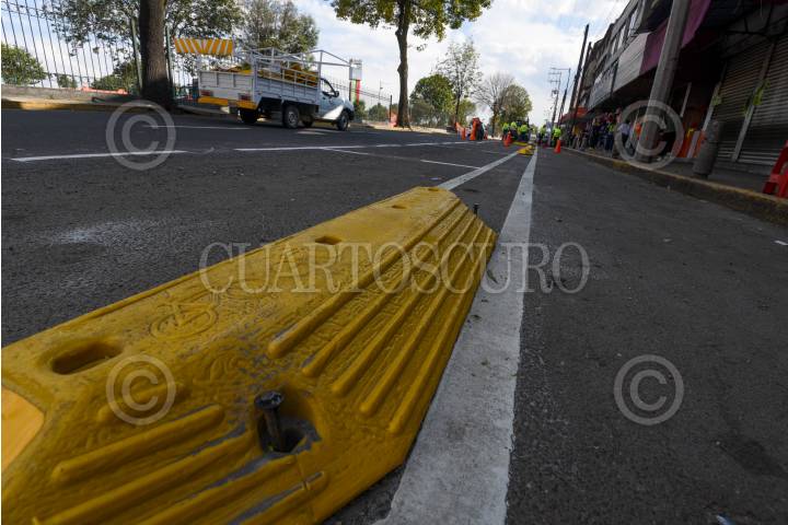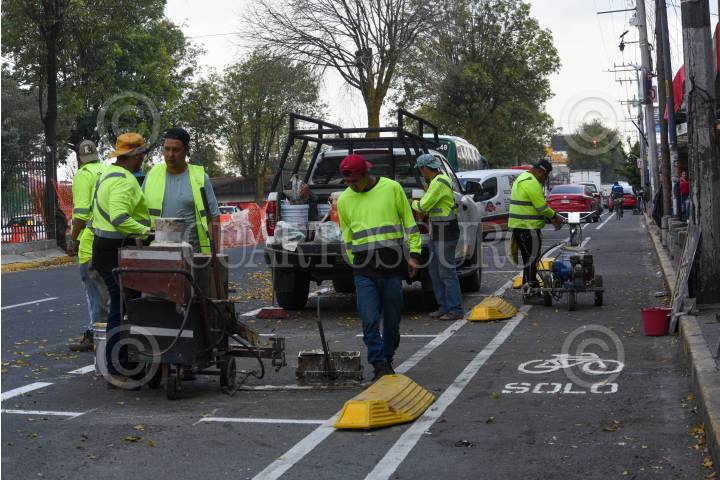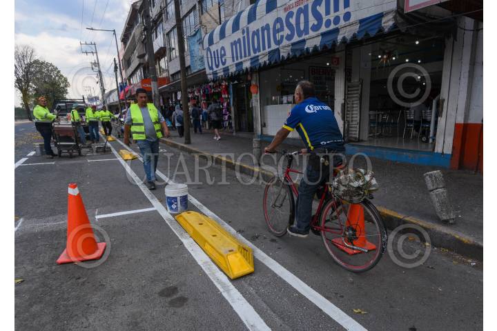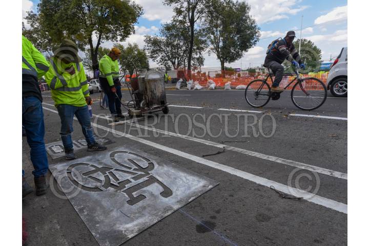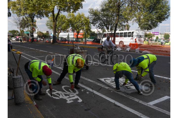 TOLUCA, ESTADO DE MÉXICO, 17OCTUBRE2024.- Avanzan los trabajos en la ciclovía de la avenida Isidro Fabela en la ciudad de Toluca, en la zona de la Terminal de Autobuses y el Mercado Juárez, trabajadores realizan la instalación de delineadores de carril, pinta de cajones y señalamientos, después de varias manifestaciones por parte de comerciantes de esta vialidad que rechazan la ciclovía. FOTO: CRISANTA ESPINOSA AGUILAR /CUARTOSCURO.COM