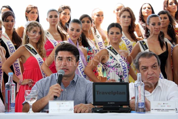 CANCÚN, QUINTANA ROO. 07JULIO2009.- Felix Gónzalez Canto, gobernador del estado y Andres Cid Fernandez, presidente de Miss España, durante la rueda de prensa para dar a conocer los pormenores del evento Miss España que se realizara en esta ciudad el próximo 18 de julio, estuvieron presentes las 52 candidatas. FOTO: AMARANTA PRIETO/CUARTOSCURO.COM