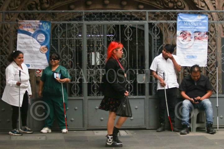CIUDAD DE MÉXICO, 06AGOSTO2025.- Un grupo de personas ciegas ofrecen masajes en el Centro Histórico. FOTO: GRACIELA LÓPEZ/CUARTOSCURO.COM