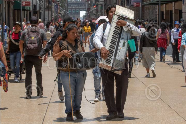 Músicos con debilidad visual ofrecen música y canciones en la calle de Madero a cambio de unas monedas.