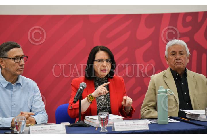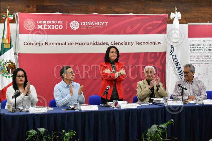 CIUDAD DE MÉXICO, 27MARZO2024.- Delia Aideé Orozco Hernández, Directora adjunta de Desarrollo Tecnológico, Vinculación e Innovación del Consejo Nacional de Humanidades, Ciencias y Tecnologías (Conahcyt); Víctor Suárez Carrera, Subsecretario de Autosuficiencia Alimentaria de la Secretaría de Agricultura y Desarrollo Rural; María Elena Álvarez-Buylla, Directora general del Conahcyt; Luis Rafael Hernández Palacios Mirón, Titular de la Procuraduría Agraria, y Hugo Raúl Paulín, subsecretario de Inclusión Productiva y Desarrollo Rural de la Secretaría del Bienestar, durante la conferencia en la que se habló sobre las acciones del Gobierno de México que den cumplimiento al decreto para prescindir del glifosato en México, y producir alimentos sin agrotóxicos. FOTO: MARIO JASSO/CUARTOSCURO.COM