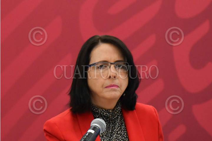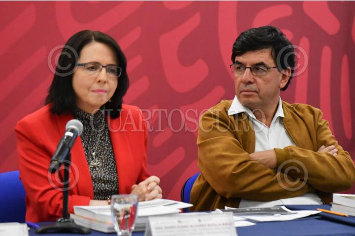 CIUDAD DE MÉXICO, 27MARZO2024.- María Elena Álvarez-Buylla, Directora general del Consejo Nacional de Humanidades, Ciencias y Tecnologías (Conahcyt), y Jesús Ramírez Cuevas, Coordinador general de Comunicación Social y vocero del Gobierno de la República, durante la conferencia en la que se habló sobre las acciones del Gobierno de México que den cumplimiento al decreto para prescindir del glifosato en México, y producir alimentos sin agrotóxicos. FOTO: MARIO JASSO/CUARTOSCURO.COM