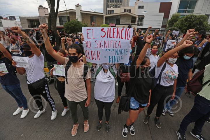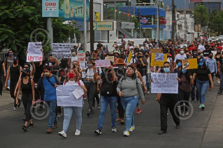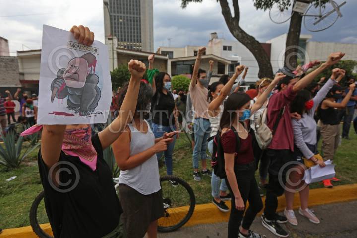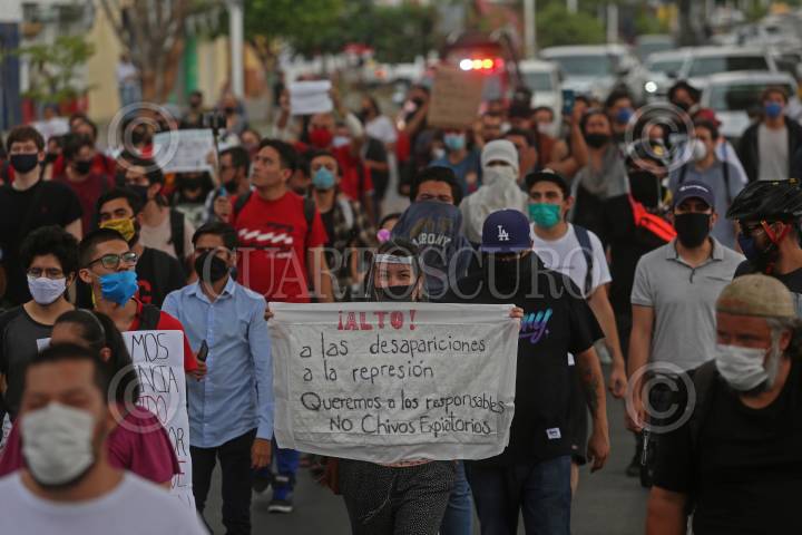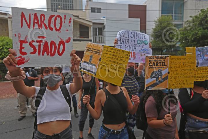 Decenas de jóvenes marchan con pancartas de protesta del Centro Universitario de Ciencias Sociales y Humanidades de la Universidad de Guadalajara (CUCSH) rumbo a Casa Jalisco, para manifestar su molestia por la muerte del joven Giovanni López a manos de la policía de Ixtlahuacán de los Membrillos.