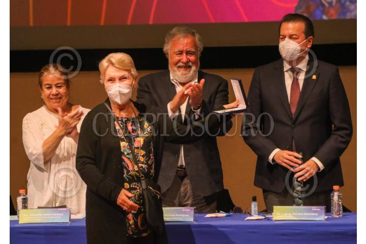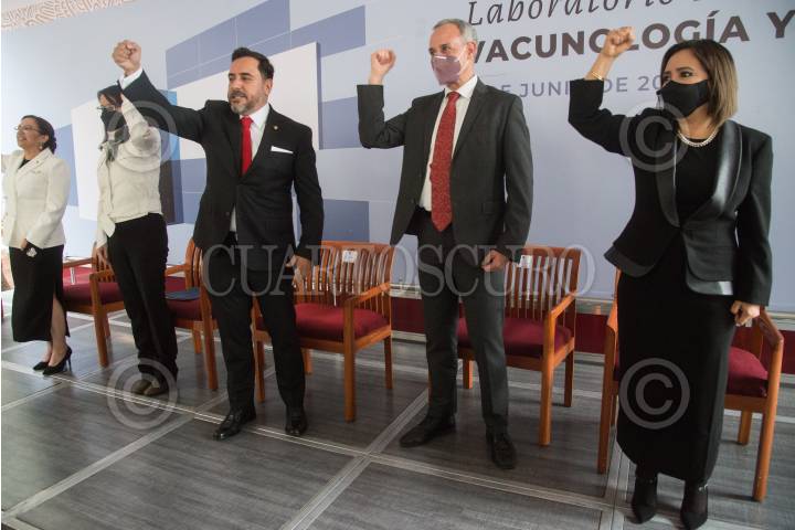 María Elena Álvarez-Buylla, directora general del CONACYT; Arturo Reyes Sandoval, director general del IPN; Hugo López-Gatell, subsecretario de Prevención y Promoción de la Salud; y Yadira Rivera Espinosa, directora de la Escuela Nacional de Ciencias Biológicas (ENCB) del IPN, entonan un "huelum" durante la inauguración y sellado simbólico del Laboratorio Nacional de Vacunología y Virus Tropicales localizado al interior de la ENCB del Politécnico.