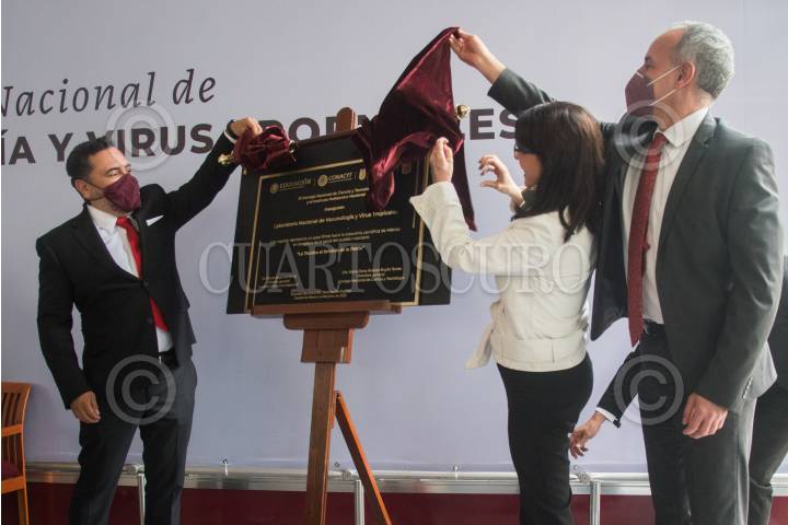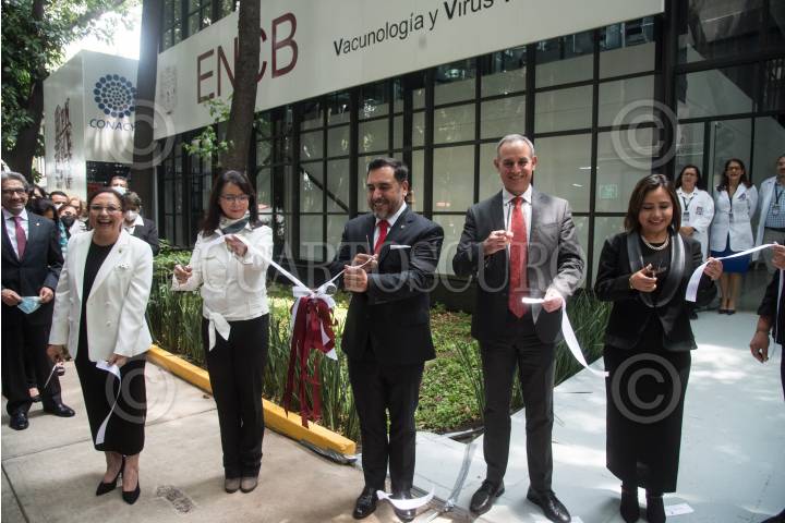 María Elena Álvarez-Buylla, directora general del CONACYT; Arturo Reyes Sandoval, director general del IPN; Hugo López-Gatell, subsecretario de Prevención y Promoción de la Salud; y Yadira Rivera Espinosa, directora de la Escuela Nacional de Ciencias Biológicas (ENCB) del IPN, encabezaron la inauguración y sellado simbólico del Laboratorio Nacional de Vacunología y Virus Tropicales localizado al interior de la ENCB del Politécnico