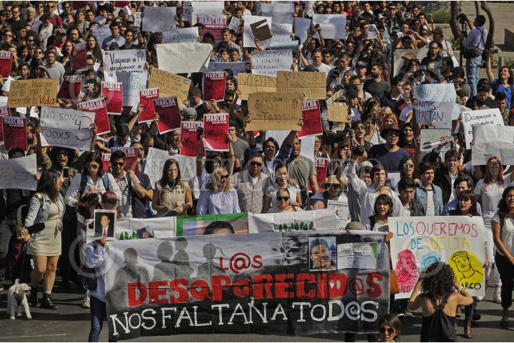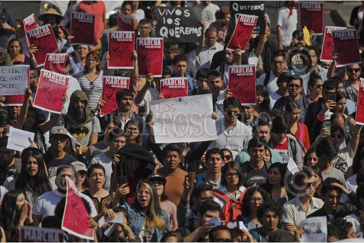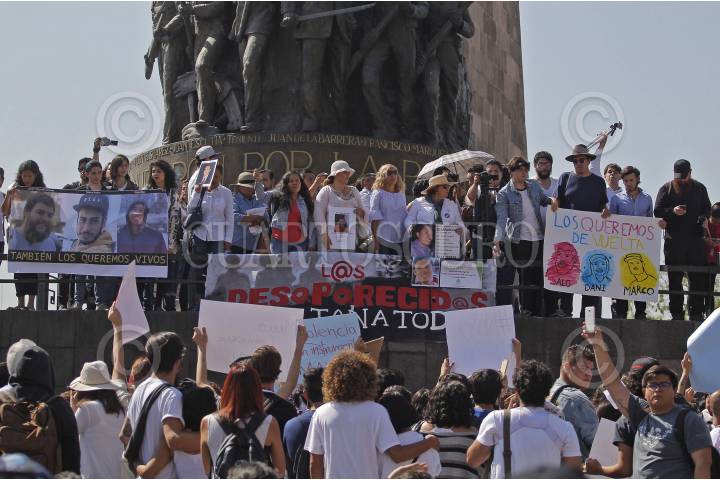 GUADALAJARA, JALISCO, 22MARZO2018.- Cientos de personas entre estudiantes, maestros, familiares y amigos, de la Universidad de Medios Audiovisuales, marcharon de las instalaciones educativas hacia el monumento a los Niños Héroes para exigir que aparezcan con vida Javier Salomón, Marcos Ávalos y Daniel Díaz estudiantes de cine, desaparecidos el pasado lunes en el municipio de Tonalá. FOTO: FERNANDO CARRANZA GARCIA / CUARTOSCURO.COM