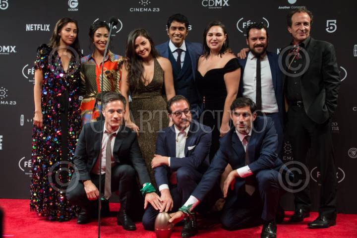 CIUDAD DE MÉXICO, 07NOVIEMBRE2018.- Los Actores de Aquí en la Tierra luego de su galardon por ensable actoral en la quinta entrega de los premios Fénix que reconocen lo mejor de la cinematografía y series de Latinoamérica, España y Portugal, celebrado en el Teatro Esperanza Iris. FOTO: ANDREA MURCIA /CUARTOSCURO.COM