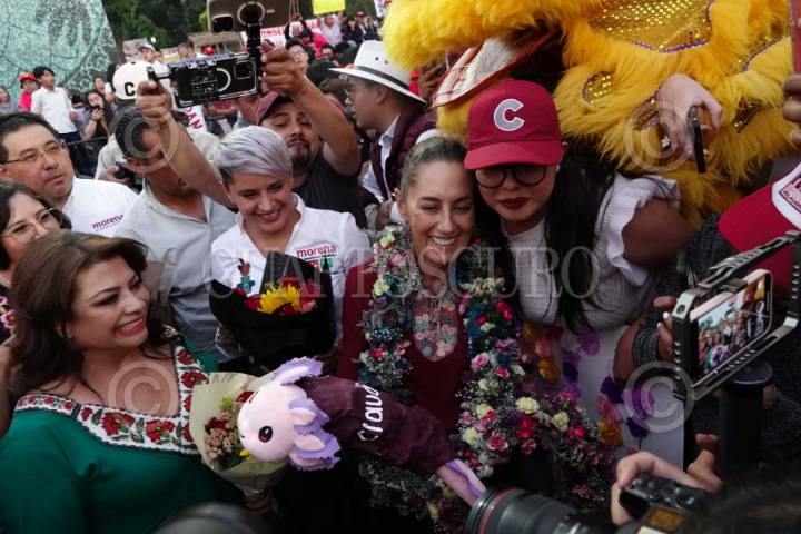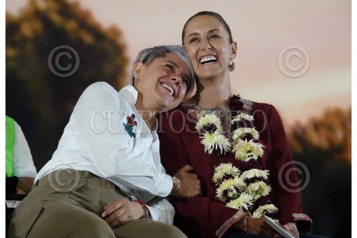 CIUDAD DE MÉXICO, 29ABRIL2024.- Clara Brugada, candidata a la Jefatura de Gobierno; Circe Camacho, candidata a la alcaldía de Xochimilco, y Claudia Sheinbaum, candidata a la presidencia, durante un mitin en la explanada de la alcaldía Xochimilco. FOTO: GRACIELA LÓPEZ /CUARTOSCURO.COM