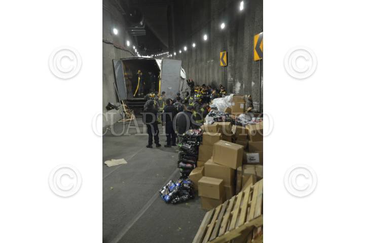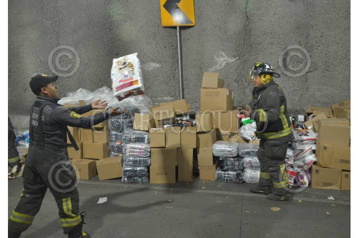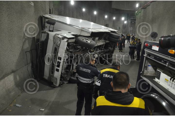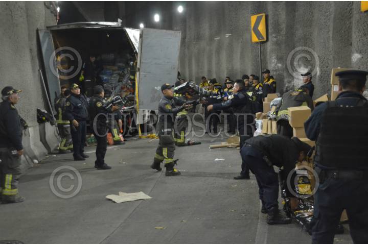 CIUDAD DE MÉXICO, 06NOVIEMBRE2019.- Una camioneta que transportaba abarrotes se volcó mientras circulaba en el puente deprimido de Circuito Interior y el eje 8 sur. De acuerdo a los reportes de las autoridades, el conductor de la unidad de carga circulaba a alta velocidad y perdió el control al tomar la curva, dicho chofer resultó con golpes menores. FOTO: ARMANDO MONROY /CUARTOSCURO.COM