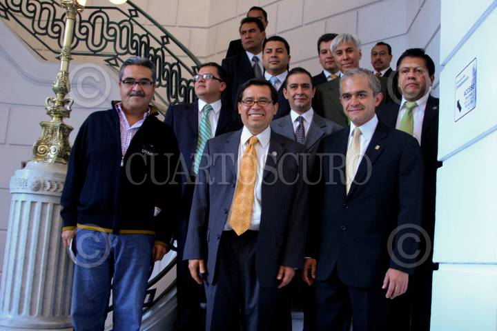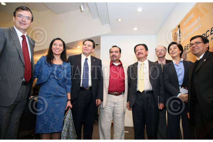 MÉXICO D.F., 12ENERO2008.- Marcelo Ebrard, jefe de gobierno del DF; Ruth Zavaleta, presidenta de la mesa directiva de la Cámara de Diputados; el senador René Arce; el senador Carlos Navarrete , la senadora Maria de los Angeles Moreno y el asambleísta Victor Hugo Cirigo al finalizar el 1er Informe de Actividades Legislativas del Senador René Arce. FOTO: ISRAEL VERA/CUARTOSCURO.COM