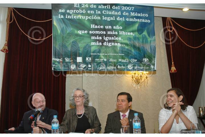 MÉXICO, D.F., 23ABRIL2008.- Manuel Mondragón, secretario de Salud del D.F.; Martha Lamas, directora de la revista Debate Feminista; el asambleísta Victor hugo Cirigo y Leticia Bonifaz, consejera juridad del gobierno del D.F., durante un desayuno celebrando el primer aniversario de la vigencia de los cambios legislativos que despenalizaron la interrupción del embarazo en el D.F. FOTO: RODOLFO ANGULO/CUARTOSCURO.COM