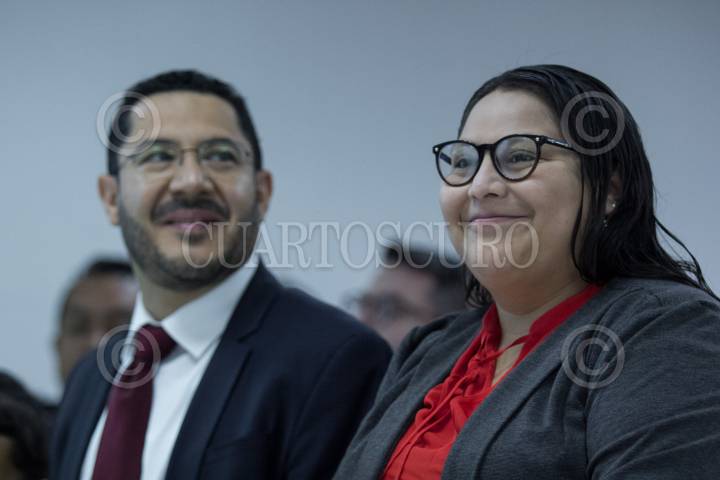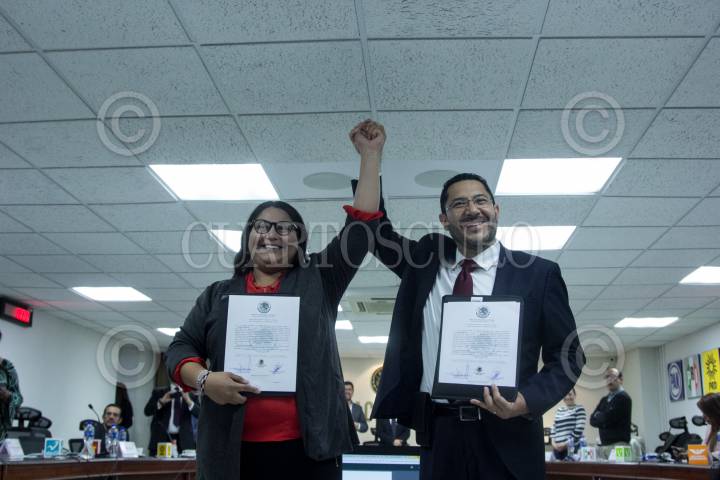 CIUDAD DE MÉXICO, 08JULIO2018.- Martí Batres Guadarrama y Minerva Citlalli Hernández, senadores electora por la coalición “Juntos Haremos Historia”, recibieron su constancia de mayoría para ocupar un curul en la Cámara Alta. De manos de Donaciano Muñoz Loyola, consejero presidente de la Junta Local Ejecutiva del INE en la Ciudad de México, y Francisco Javier Morales Morales, secretario del Consejo, los morenistas fueron reconocidos ante el Instituto Nacional Electoral (INE) como ganadores de los comisión del pasado primero de julio. FOTO: GALO CAÑAS /CUARTOSCURO.COM