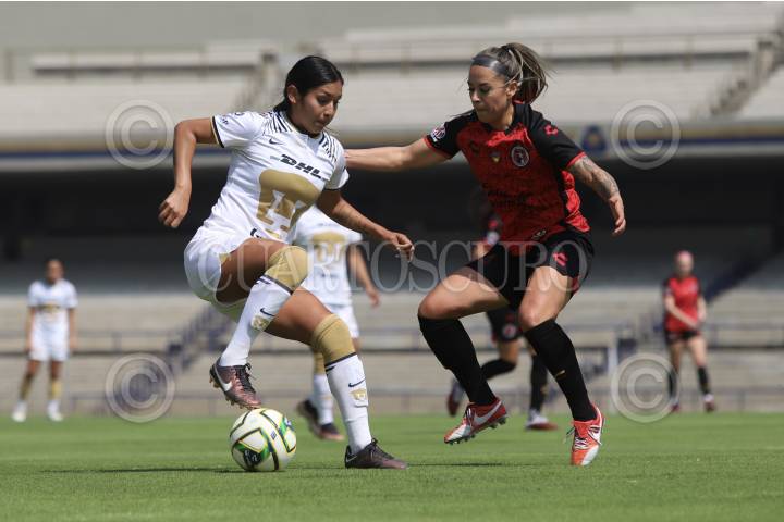 Citlali Hernández De Pumas y Verónica Pérez de Xolas disputan una pelota durante partido de fútbol Pumas vs Tijuana correspondiente a la jornada 6 del Torneo Clausura 2023 de Liga BBVA MX Femenil, en el Estadio Olímpico Universitario.