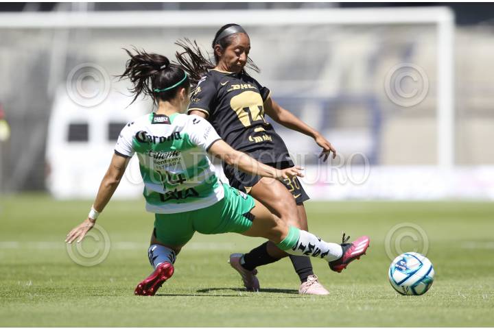 Katia Estrada de Santos barre a Citlali Hernández de Pumas durante partido de fútbol Pumas vs Santos correspondiente a la jornada 7 del Torneo Clausura 2023 de Liga BBVA MX Femenil, en el Estadio Olímpico Universitario.