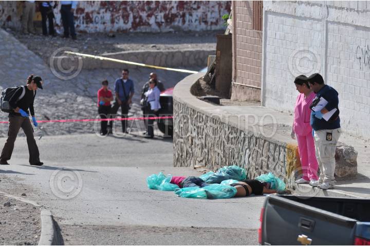 CIUDAD JUÁREZ, CHIHUAHUA, 12AGOSTO2011.- Dos mujeres fueron localizadas sin vida en la colonia Niños Héroes, en plena vía pública. El hallazgo se registró alrededor de las 07:40 horas, entre la calle Begonias y el Viaducto, lo que alertó a los vecinos del sector, quienes hicieron el llamado a las autoridades para que se hicieran cargo de las indagatorias correspondientes. Los cuerpos fueron asfixiados y torturados, ya que presentaban una bolsa de plástico verde en la cabeza y múltiples golpes. Se desconoce la identidad de las féminas y las causas de su deceso. FOTO: NACHO RUÍZ/CUARTOSCURO.COM