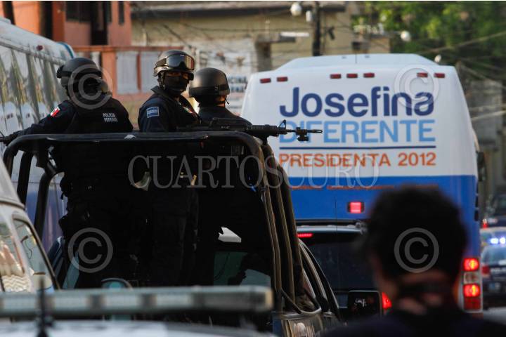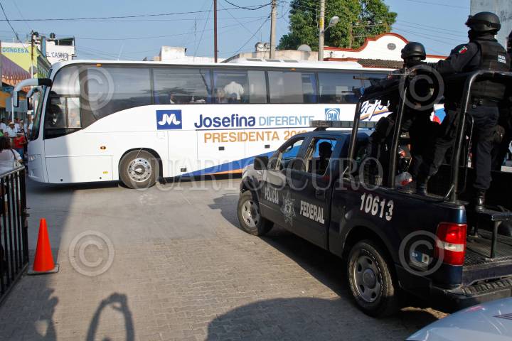 CIUDAD VALLES, SAN LUIS POTOSÍ, 20ABRIL2012.- Policías federales custodian el autobus "La Jefa", donde viaja Josefina Vázquez Mota, candidata a la Presidencia de la República por el Partido Acción Nacional, a su salida en este municipio, donde encabezó un mitin proselitista. FOTO: ISAAC ESQUIVEL /CUARTOSCURO.COM