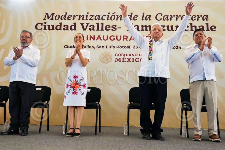 CIUDAD VALLES, SAN LUIS POTOSÍ. 23AGOSTO2024.- Andrés Manuel López Obrador, presidente Constitucional de los Estados Unidos Mexicanos, y Claudia Sheinbaum Pardo, presidenta Electa de los Estados Unidos Mexicanos presiden Inauguración de la modernización de la carretera Ciudad Valles – Tamazunchale. Los acompañan Jesús Antonio Esteva Medina, secretario de Obras y Servicios de la Ciudad de México y próximo secretario de Infraestructura, Comunicaciones y Transportes; Jorge Nuño Lara, secretario de Infraestructura, Comunicaciones y Transportes; José Ricardo Gallardo Cardona, gobernador Constitucionaldel Estado de San Luis Potosí; Rosa Icela Rodríguez Vázquez, secretaria de Seguridad y Protección Ciudadana y próxima secretaria de Gobernación y Juan Pablo de Botton Falcón, ubsecretario de Egresos de la Secretaría de Hacienda y Crédito Público. FOTO: PRESIDENCIA/CUARTOSCURO.COM