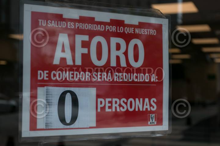 El letrero de un restaurante de comida rápida en el centro de la capital indica que no hay acceso a comensales por motivos de salud. Hasta un 90% de comercios han bajado sus cortinas durante la pandemia de covid-19.