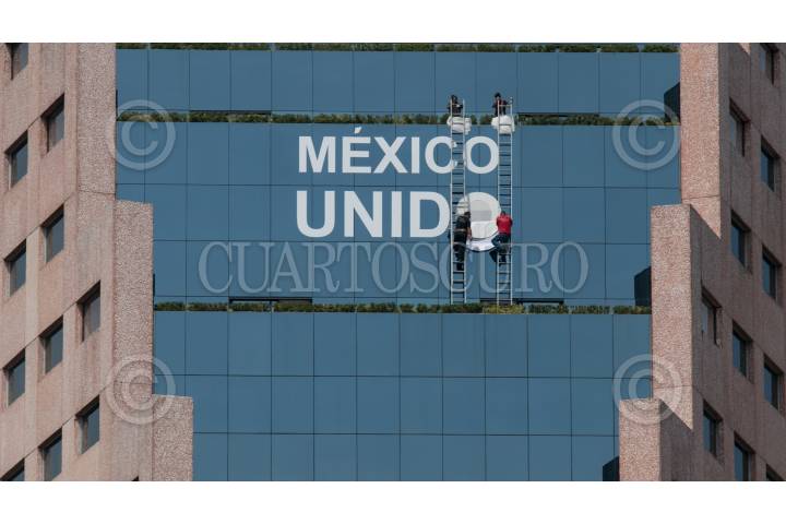 Trabajadores colocan la leyenda "México Unido" en uno de los hoteles de la colonia Centro. La medida QuédateEnCasa es la principal del gobierno para el combate a la emergencia sanitaria de Covid-19.