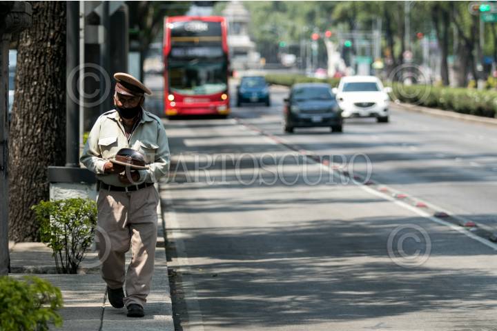 Un organillero pide monerdas en una semivacía Avenida Paseo de la Reforma. Miles de ciudadanos que viven al día continúan saliendo a laborar.