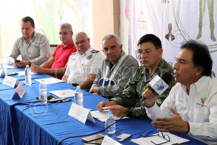CUERNAVACA, MORELOS, 07FEBRERO2019.- Conferencia de prensa donde el Consejo Ciudadano de Seguridad Publica presento el programa "Soldado amigo" por medio del cual se capacitará a los militares en temas de derechos humanos y prevención del delito, además de que a partir de este momento soldados podrán ingresar a los comercios que participan en el programa para que coadyuven en la inhibición de delitos, anunció el General de la 24 Zona Militar Armando Gómez Mendoza. En la imagen de izquierda a derecha los empresarios Harry Nielsen, José Antonio Sánchez Púron, el comisionado de seguridad José Antonio Ortiz Guarneros, el presidente del consejo, Rafael Rueda Moncalian, el comandante de la 24 Zona Militar Armando Gómez Mendoza y Jorge Olivares Brito presidente de la Comisión Estatal de Derechos Humanos. FOTO: MARGARITO PÉREZ RETANA /CUARTOSCURO.COM