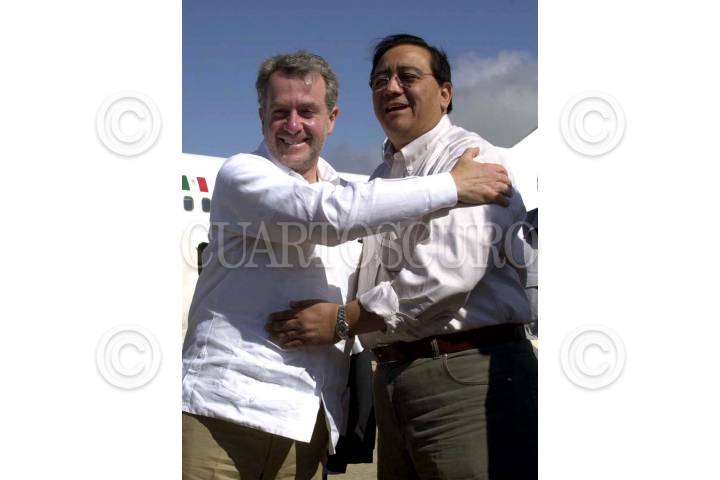 TUXTLA, CHIAPAS 14ABRIL 2004.- El Secretario de Gobernación Santiago Creel es recibido por el gobernador Pablo Salazar , en el aeropuerto San Juan Ocozocuautla, para asistir a la entrega de equipo contra incendios forestales. FOTO: Sandra Perdomo/CUARTOSCURO.COM