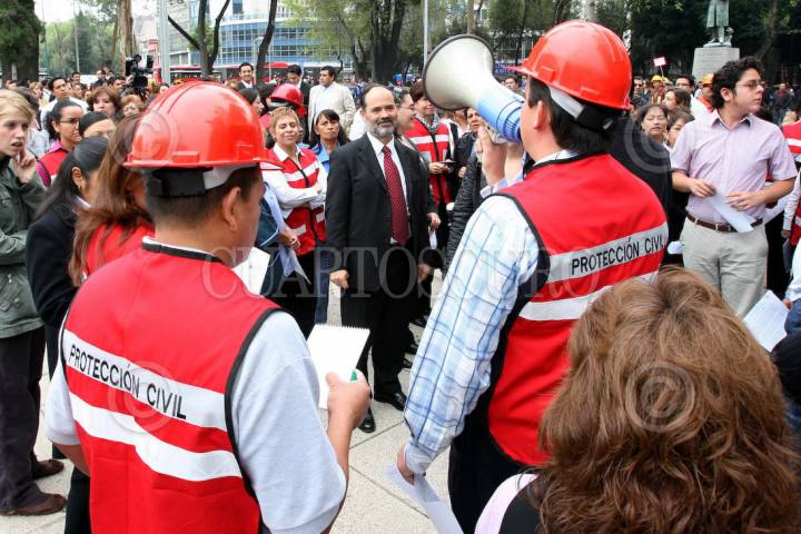 MÉXICO, D.F., 18SEPTIEMBRE2009.- Gustavo Madero Muñoz, coordinador de Grupo parlamentario del PAN en el senado de la República, durante el simulacro de sismo con la participación de 176 personas, se realizó en 5 minutos y 58 segundos, el edificio sede de Torre Azul fue evacuado en orden y calma. Los brigadistas y todo el personal cumplieron con su responsabilidad con lo cual contribuyeron a fortalecer la cultura de la protección civil. FOTO: CUARTOSCURO.COM