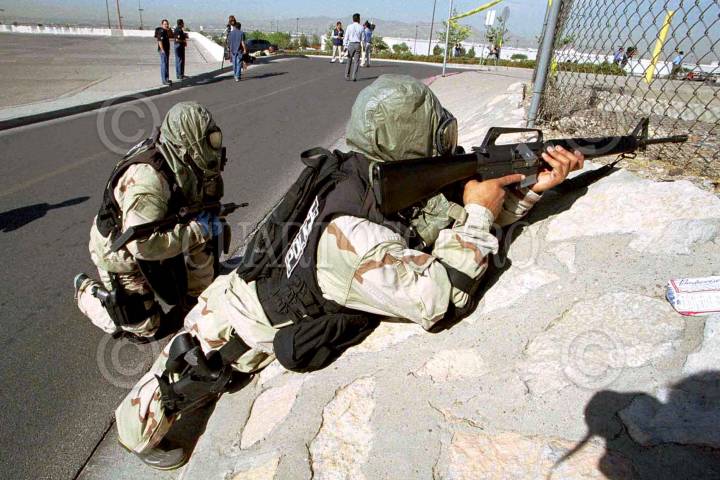 Efectivos militares con fusiles de asalto y máscaras anti-gases, práctican un simulacro con el fin de estar preparados ante un eventual ataque terrorista. Elementos de todas corporaciones polIciacas y militares estadunidenses llevan este tipo de acciones en toda la nación norteamericana. Foto: JGuadalupe Perez/CUARTOSCURO.COM