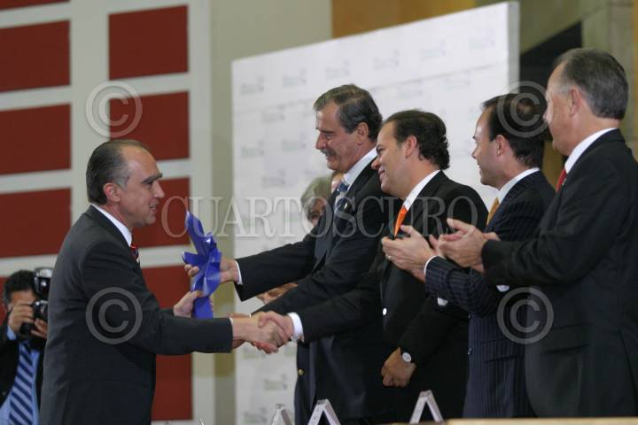 MEXICO, D..F. 11 NOVIEMBRE 2004.- Fernando Canales Clariond, secretario de Economía, recibió de manos del presidente Vicente Fox el reconocimiento a Cartas de Compromiso Ciudadano, ceremonia realizada en el salón Adolfo López Mateos de Los Pinos. FOTO: Sandra Perdomo/CUARTOSCURO.COM