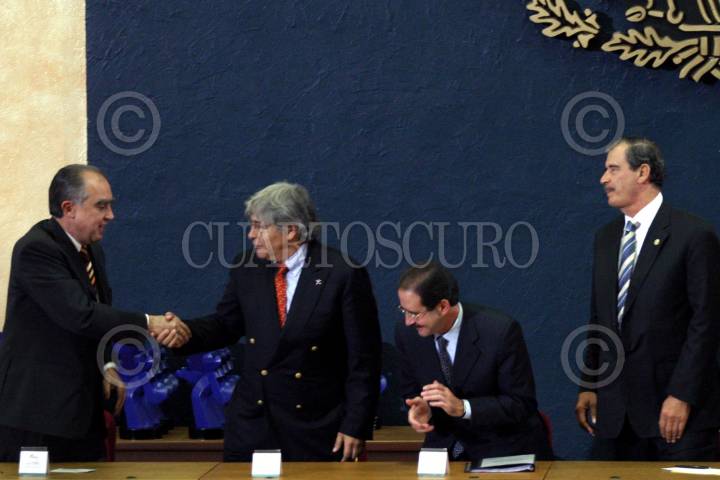 MEXICO, D.F. 20JULIO2005.- Fernando Canales Clariond, secretario de economía Fernando Elizondo Barragán, secretario de energía, durante la presentación del Programa de Promoción de Investigaciones y Tecnología en apoyo con la Organización de las Naciones Unidas para el Desarrollo Industrial ( ONUDI ). FOTO: Osvaldo Aguilar/CUARTOSCURO.COM