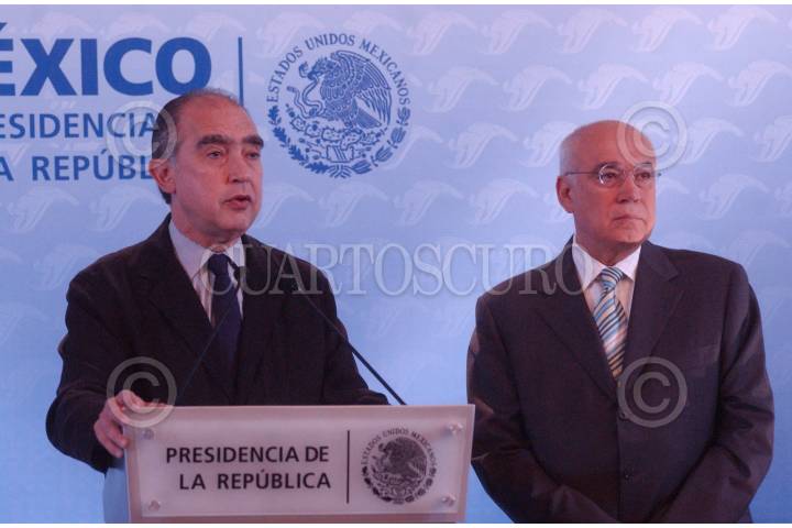 MEXICO D.F. 22MAYO2006.- Fernando Canales Clariond, Secretario de Energia y Rúben Aguilar Valenzuela, Vocero de la Presidencia, durante conferencia de prensa en el salón Venustiano Carranza en la Residencia Oficial de los Pinos. FOTO: Ariel Gutierrez/PRESIDENCIA/CUARTOSCURO.COM