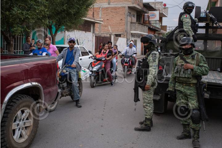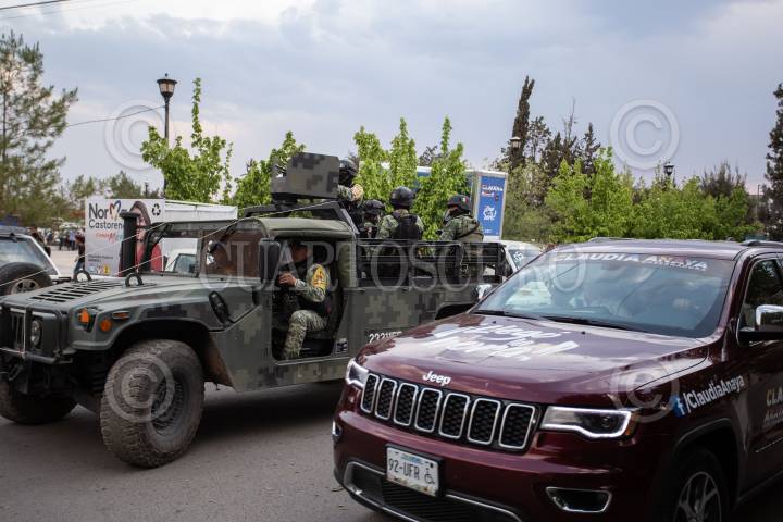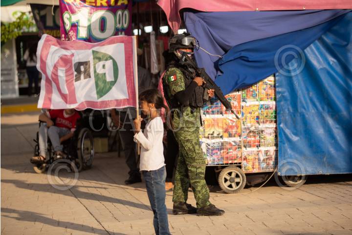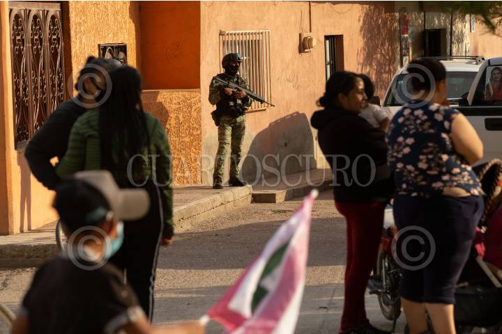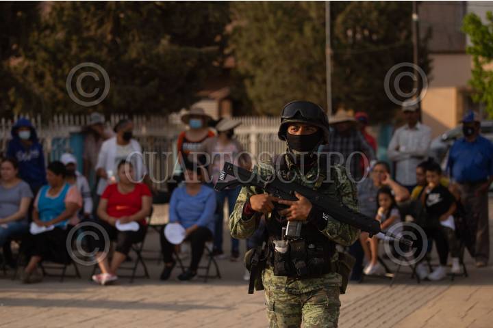 Soldados del Ejercito Mexicano resguardan evento de campaña en la comunidad de San José de Lourdes, Fresnillo, previo a las eleciones del próximo 6 de junio.