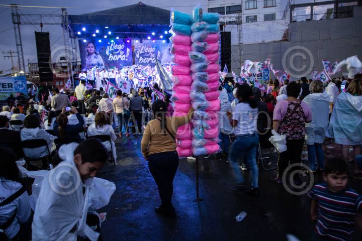 Vendedora de algodones de azúcar escucha mitin proselitista.