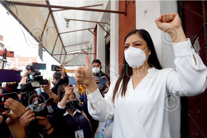 Claudia Rivera, candidata a la presidencia municipal de Puebla por la coalición Juntos Haremos Historia, durante la emisión de su voto.