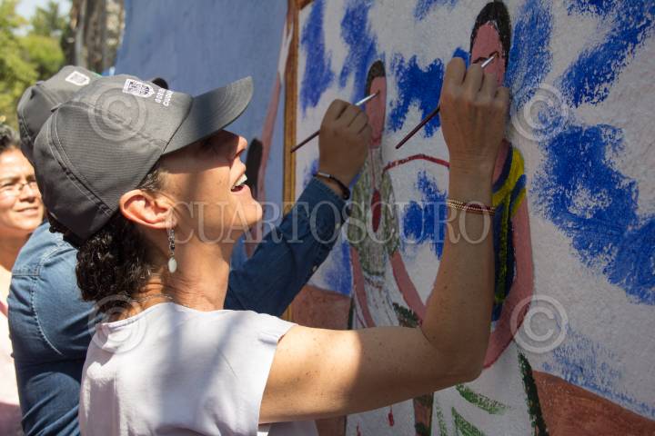 CIUDAD DE MÉXICO 09MARZO2019.- Claudia Sheinbaum, Jefa de Gobierno, acudió al Sábado de Tequio en la colonia Anahuac, alcaldía Miguel Hidalgo. Como primera actividad, pintó el rostro del mural en la barda de una escuela. FOTO: GUADALUPE HERRERA/CUARTOSCURO.COM