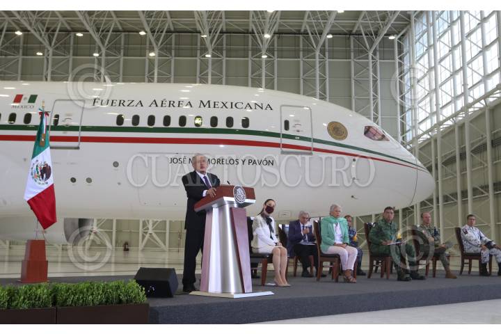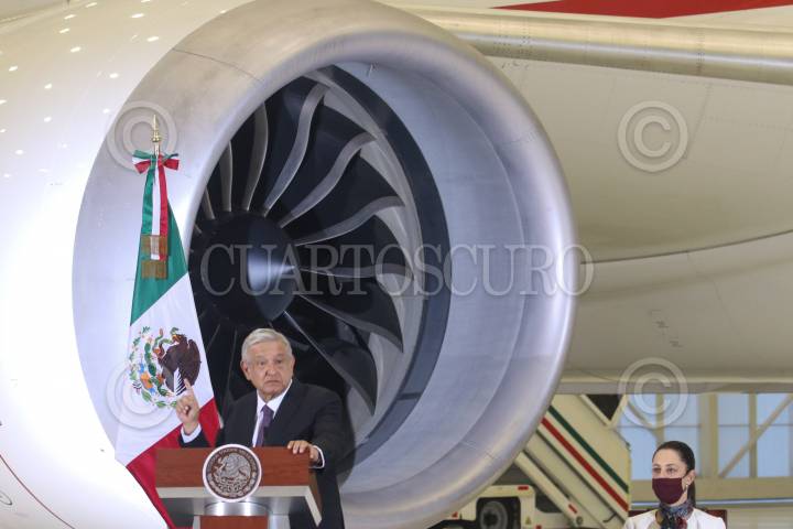 Andrés Manuel López Obrador, presidente de México, acompañado de su gabinete, durante la conferencia matutina en el 6/o Grupo Aéreo de la Zona de Hangares del AICM
