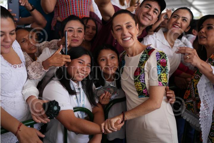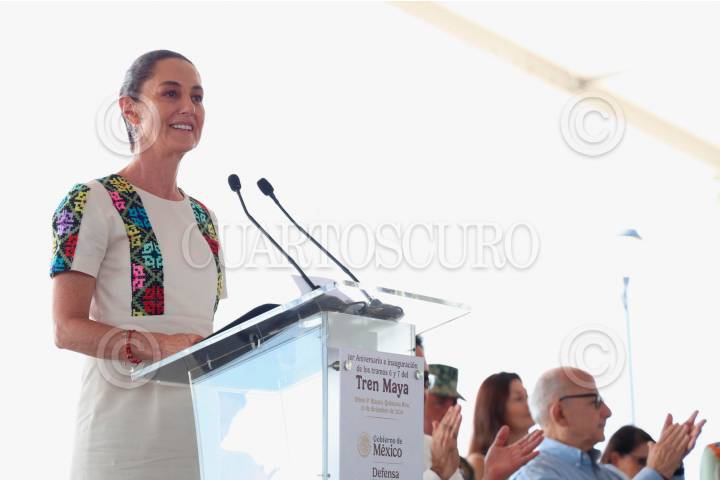 CHETUMAL, QUINTANA ROO, 15DICIEMBRE2024.- Claudia Sheinbaum, Presidenta de México, y Mara Lezama, gobernadora de Quintana Roo, celebraron el primer aniversario e inauguran los tramos 6 y 7 del Tren Maya, una hazaña histórica lograda en tan solo 4 años. La mandataria federal destacó que esta emblemática obra hoy completa su circuito de mil 554 kilómetros de esperanza, impulsado por el entonces presidente Andrés Manuel López Obrador. En el evento realizado frente a la Bahía de Chetumal, con la asistencia de las y los gobernadores por donde transita el Tren Maya ahí anunció la construcción de los trenes México – Nuevo Laredo, México – Nogales. Para significar y dejar testimonio de este aniversario, la presidenta Claudia canceló un timbre postal y cortó el listón inaugural de los tramos 6 y 7 del Tren Maya. FOTO: PRESIDENCIA/CUARTOSCURO.COM/CUARTOSCURO.COM