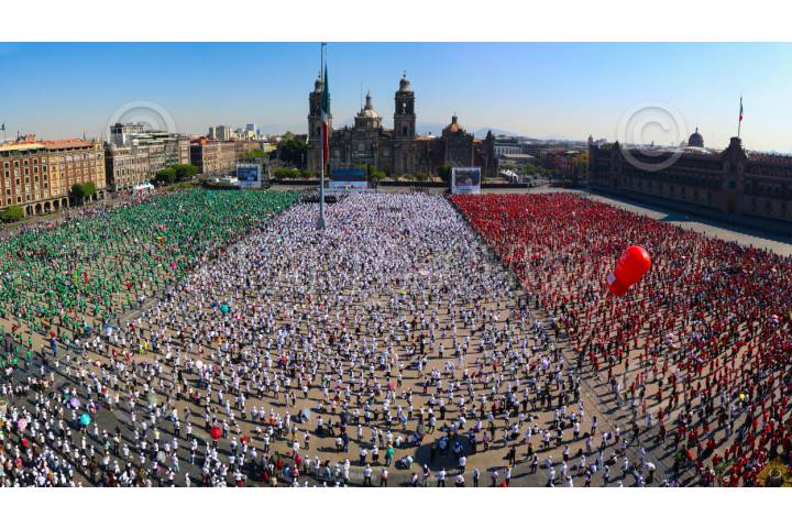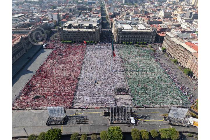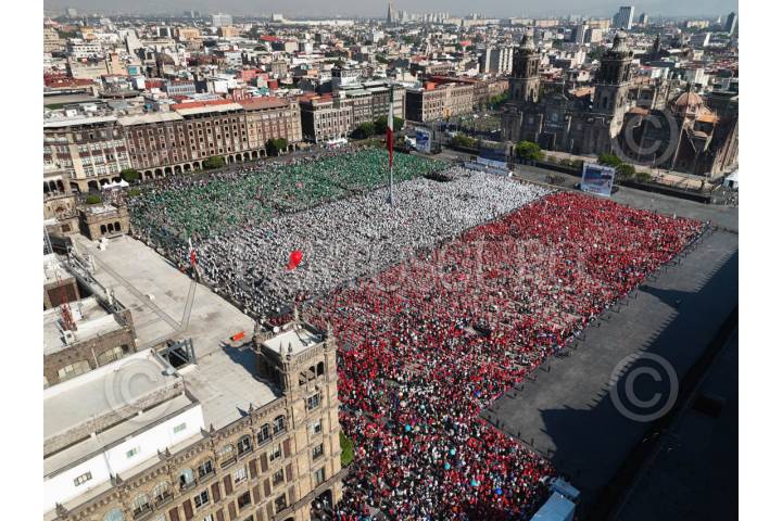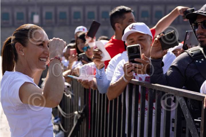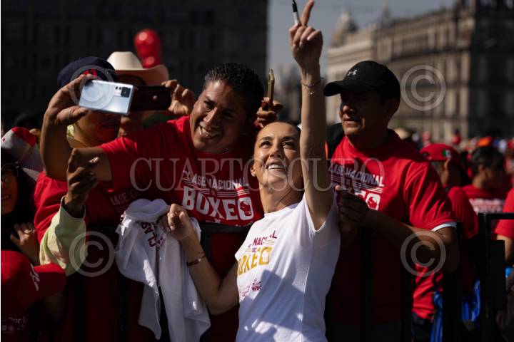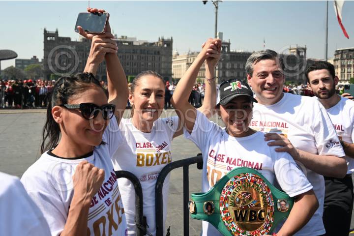 CIUDAD DE MÉXICO, 06ABRIL2025.- Claudia Sheinbaum, jefa de Gobierno, encabezó la Clase Nacional de Box, para fomentar la activación física entre la población ya que esta activación física se realizó en varios estados del país. En el Zócalo ante miles de personas la jefa del Ejecutivo práctico los jab y opertcut en compañía de leyendas del box como Julio César Chávez y Oscar de la Hoya. FOTO: PRESIDENCIA/CUARTOSCURO.COM