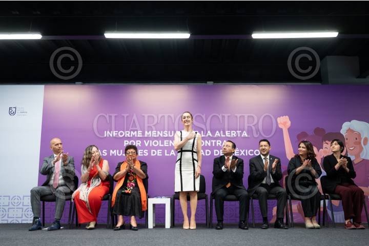 Ingrid Gómez Saracíbar, Ernestina Godoy, Claudia Sheibaum, Rafael Guerra Álvarez, y Martí Batres, durante la presentación del informe de resultados de la alerta por violencia contra las mujeres.