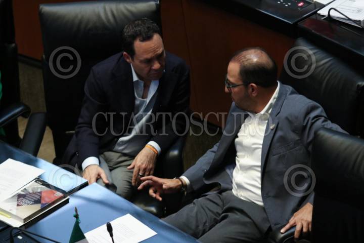CIUDAD DE MÉXICO, 26JUNIO2025.- Clemente Castañeda, senador de Movimiento Ciudadano, y Ricardo Anaya, senador de Morena, durante la sesión extraordinaria del Senado de la República en la que se discute la Ley Reglamentaria del Servicio Ferroviario y la minuta por la que el Instituto Nacional de Estadística, Geografía e Informática (Inegi) asumirá las funciones del Consejo Nacional de Evaluación de la Política de Desarrollo Social (Coneval). FOTO: MARIO JASSO/CUARTOSCURO.COM